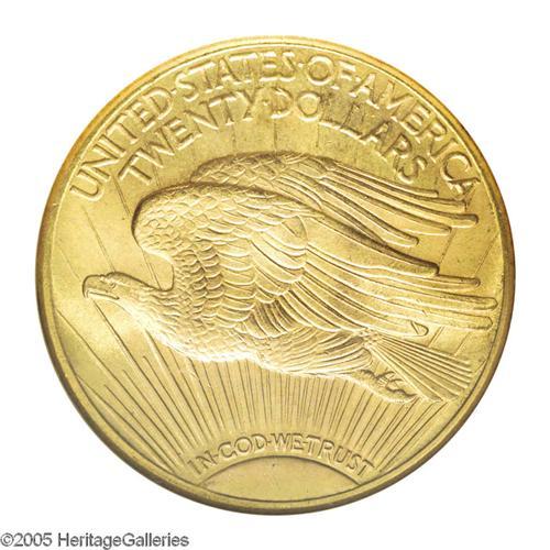 <B>1923-D<$20> MS66 NGC.</B></I> The 1923-D, when offered in high grades, typically comes nice. This premium quality Gem is no exception. Beautiful copper-gold color graces lustrous, frosty finished surfaces. Neither the sharp strike nor the smooth features are worthy of criticism, although we do note a couple of small marks on the reverse over the face of the sun. A lovely representative of the type.