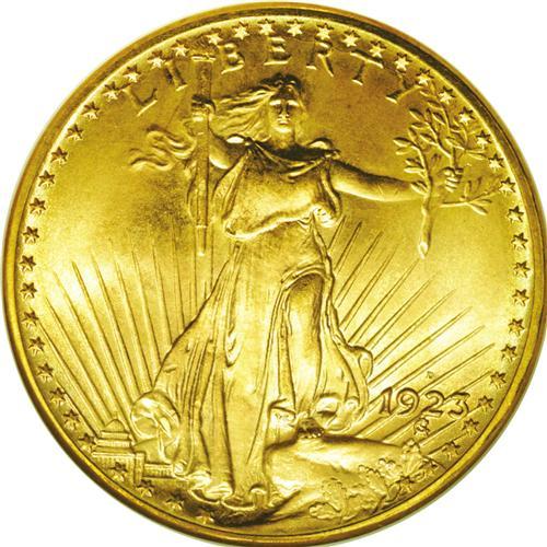 <B>1923-D<$20> MS66 NGC.</B></I> This is an impressive Premium Gem with highly lustrous and frosty yellow-gold surfaces that are accented by traces of green and orange color. The date is considered to be a common date in the series, and it is the only easily obtainable branch Mint double eagle of the decade.