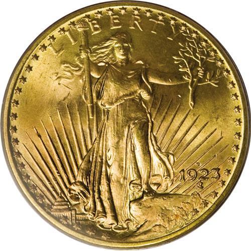 <B>1923-D $20 MS66 PCGS.</B></I> A shining Premium Gem, yellow-gold with a hint of green on each side. The detail is strong, and aside from a couple of small luster breaks on the reverse, the overall eye appeal is uniformly stupendous. The only readily available branch mint postwar issue.<BR><BR><b>Shipping:</b> Coin/Currency (<a target="_blank" href="http://www.heritageauctions.com/common/shipping.php">view shipping information</a>)