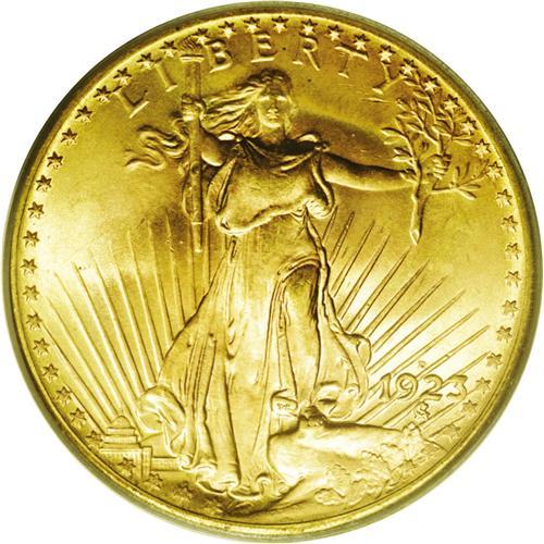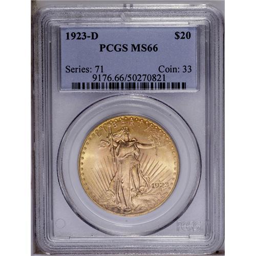 <B>1923-D<$20> MS66 PCGS.</B></I> Blazing luster throughout and boldly executed by the dies. A loupe will discover minute abrasions but none are of consequence on this majestic Saint-Gaudens double eagle. The upper obverse has a trace of haze near the rim. If you demand a coin with abundant eye appeal and desirable surface quality, then here is one to consider. <BR><BR><B>Important notice:</B> Heritage usually auctions material at the rate of 200-250 lots per hour. On some occasions eBay Live bid software or the Internet may not be able to keep up with the pace of the auction. We recommend placing a realistic absentee bid now as insurance to avoid disappointment. Occasionally the auctioneer may eliminate or reject an eBay Live bid, and the auctioneer may also reopen a lot after the close of the eBay live bidding (usually because we missed an audience bid), and may reject your bid even if it shows you as the winning bidder. By bidding via eBay Live, you agree that Heritage may award the lot to another bidder at its sole discretion under the circumstances described above or any other reasonable circumstances. Since eBay bids are not shown to us until we open the lot on the floor, we treat those bids just like floor bids. In most cases the floor responds before the eBay bid is presented to us, due to Internet lag time, so for consistency we have made it a policy that floor bids are always considered first over tie eBay live bids. Also please note that all Heritage lots purchased through eBay Live carry a 20% Buyer's Premium. Please make sure you read the Terms and Conditions before you bid. This lot is being auctioned in conjunction with a live floor auction by Heritage Galleries & Auctioneers. All final auction and invoice information will be supplied by Heritage Galleries & Auctioneers, and all other information should be considered preliminary. Lot:4692 <BR><BR><B>Winning Notification and Billing:</B> After the FINAL session in this auction is complete, Heritage will send e-mail and snail mail invoices. This process normally takes several days. All final auction and invoice information will be supplied by Heritage Galleries & Auctioneers, and all other information should be considered preliminary. <BR><BR>This auction will be conducted on a live auction floor and over the Internet through eBay Live. If you choose to place an absentee bid, please take a moment to <font color='#0000ff'><u><a href='http://pages.ebay.com/liveauctions/help/before/laabsentee.html'>learn how eBay Live absentee bidding works</a></u></font><font color='#000000'>