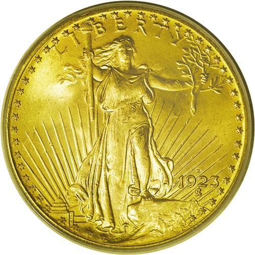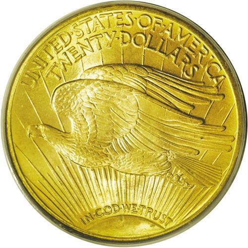 <B>1923-D<$20> MS66 PCGS.</B></I> Outrageous luster and color, as one would expect from a 1923-D. The striking details are fully brought up. The only detracting marks are visible on the reverse partially secluded within the eagle's wings. A must-see coin.<BR><I>From The Jackson Hole Collection.</B></I>