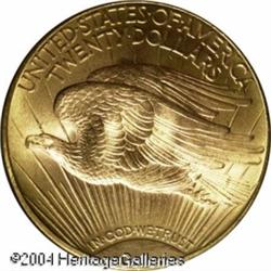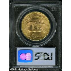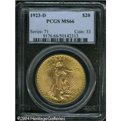 1923-D $20 MS66 PCGS. Intense luster with copper-g <B>1923-D $20 MS66 PCGS.</B></I> Intense luster with copper-gold and soft-green highlights. A few trivial luster grazes are noticed on Liberty's gown. 1923-D Twenties are known to be among the flashiest of all Saint-Gaudens' issues and this example certainly lives up to that reputation. <BR><BR><B>Important notice:</B> Heritage usually auctions material at the rate of 200-250 lots per hour. On some occasions eBay Live bid software or the Internet may not be able to keep up with the pace of the auction. We recommend placing a realistic absentee bid now as insurance to avoid disappointment. Occasionally the auctioneer may eliminate or reject an eBay Live bid, and the auctioneer may also reopen a lot after the close of the eBay live bidding (usually because we missed an audience bid), and may reject your bid even if it shows you as the winning bidder. By bidding via eBay Live, you agree that Heritage may award the lot to another bidder at its sole discretion under the circumstances described above or any other reasonable circumstances. Since eBay bids are not shown to us until we open the lot on the floor, we treat those bids just like floor bids. In most cases the floor responds before the eBay bid is presented to us, due to Internet lag time, so for consistency we have made it a policy that floor bids are always considered first over tie eBay live bids. Also please note that all Heritage lots purchased through eBay Live carry a 20% Buyer's Premium. Please make sure you read the Terms and Conditions before you bid. This lot is being auctioned in conjunction with a live floor auction by Heritage Galleries & Auctioneers. All final auction and invoice information will be supplied by Heritage Galleries & Auctioneers, and all other information should be considered preliminary. Lot:7192