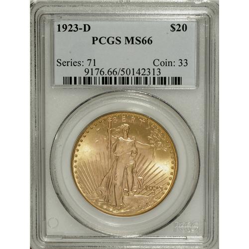 <B>1923-D $20 MS66 PCGS.</B></I> Intense luster with copper-gold surfaces and delicate emerald highlights. A few trivial luster grazes are noticed on Liberty's gown. Most 1923-D double eagles are highly appealing, and the issue is the most common branch mint choice for the type collector.<BR><BR><b>Shipping:</b> Coins & Currency (<a target="_blank" href="http://www.heritageauctions.com/common/shipping.php">view shipping information</a>)