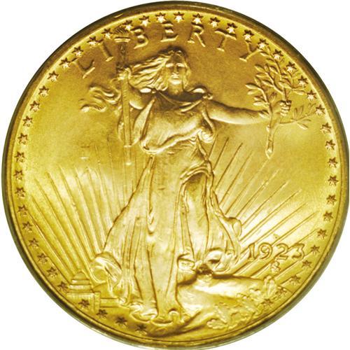 <B>1923-D<$20> MS66 PCGS.</B></I> Potent luster dominates this nearly unblemished apricot-gold premium Gem. Aside from minor flatness on Liberty's nose, the strike is unimprovable, and the quality is obvious. The 1923-D is unique among post-war branch mint issues in that a significant quantity escaped the furnaces that condemned the majority of double eagles from this era.