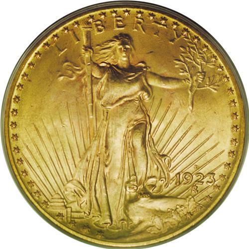 <B>1923-D $20 MS66 PCGS.</B></I> The 1923-D is the only postwar branch mint issue readily encountered in Mint State. The surfaces of this Premium Gem are richly covered with mint luster and show light, variegated colors of apricot-gold and pale-green, along with sharply struck design elements. A handful of small marks on each side are not bothersome.<BR><BR><b>Shipping:</b> Coins & Currency (<a target="_blank" href="http://www.heritageauctions.com/common/shipping.php">view shipping information</a>)