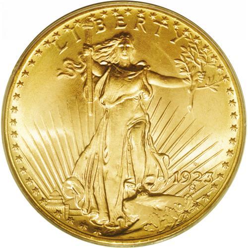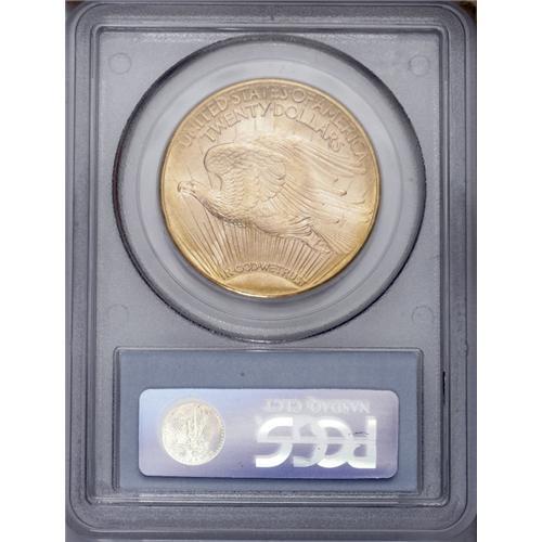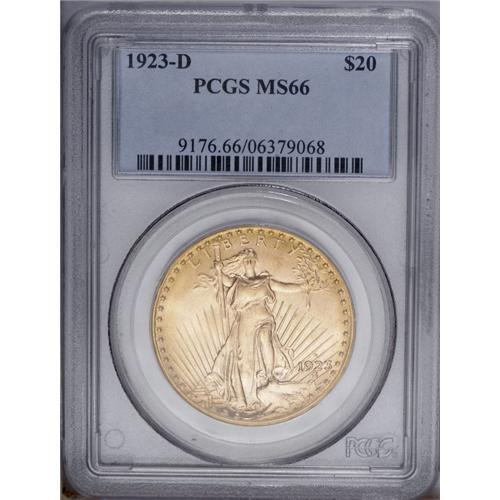 <B>1923-D $20 MS66 PCGS.</B></I> The Denver Mint produced only silver dollars and double eagles during the year, for a total of 8,513,250 coins, including 1,702,250 of these double eagles. The present example is a splendid one, as attractive as any we have seen. The surfaces are fully lustrous with beautiful pinkish-gold coloration, and the design elements are boldly rendered. Population: 1166 in 66, 54 finer (1/06).