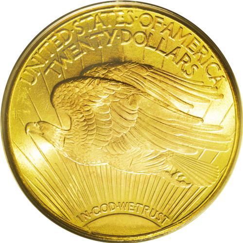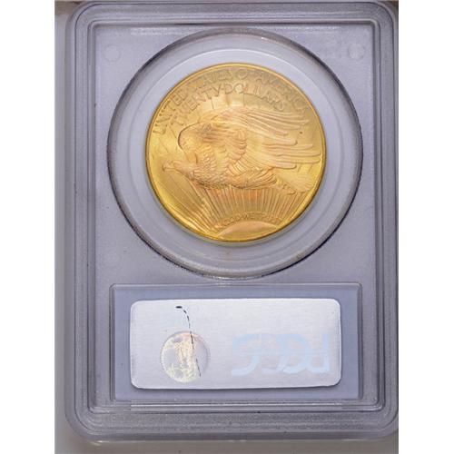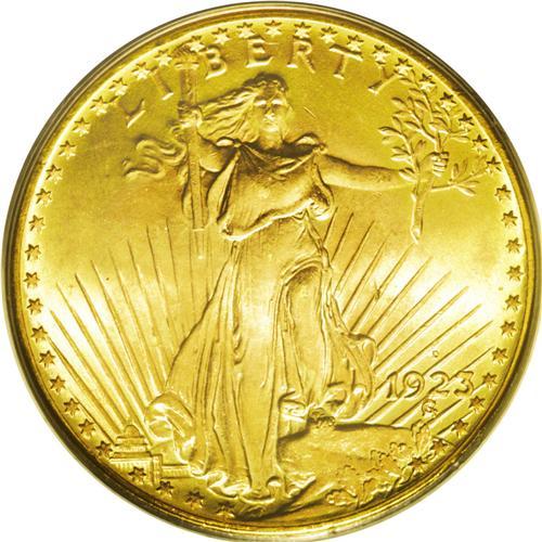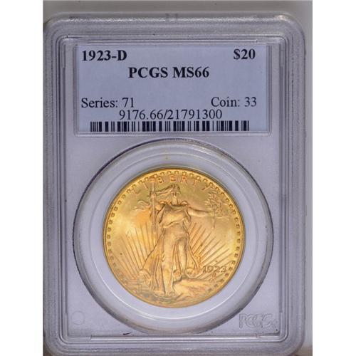 <B>1923-D<$20> MS66 PCGS.</B></I> The luster of this piece is simply breathtaking: wonderful frost, a few spots in the obverse fields with reflectivity, and plenty of overall appeal. The bold strike complements the lovely luster, and the yellow-gold surfaces have a near-complete absence of marks. For the type or date collector who wants a truly special coin.