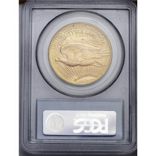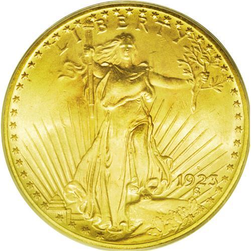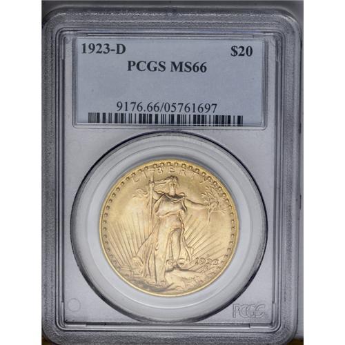 <B>1923-D<$20> MS66 PCGS.</B></I> David Bowers (2004) writes that: "The 1923-D is one of the few readily available mintmarked issues of the 1920s, and in terms of Gem MS65 or finer coins is the most plentiful." The surfaces of this Premium Gem are richly overlaid with mint luster and show light, variegated colors of apricot-gold and pale-green, along with sharply struck design elements. A handful of small marks on each side are not bothersome. An attractive double eagle that is very scarce any finer.