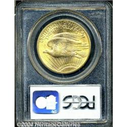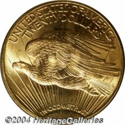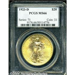 <B>1923-D<$20> MS66 PCGS.</B></I> Easily one of the best produced of the branch mint Saint-Gaudens issues and a favorite selection among type coin collectors. This outstanding example boasts intense, satiny luster overlain by gorgeous apricot-gold patination that reveals subtle variations in hue when the coin is tilted under a light source. A few small, trivial abrasions on the lower part of Liberty's left leg, and on the feathers of the eagle's left wing, are not at all distracting. <BR><BR><B>Important notice:</B> Heritage usually auctions material at the rate of 200-250 lots per hour. On some occasions eBay Live bid software or the Internet may not be able to keep up with the pace of the auction. We recommend placing a realistic absentee bid now as insurance to avoid disappointment. Occasionally the auctioneer may eliminate or reject an eBay Live bid, and the auctioneer may also reopen a lot after the close of the eBay live bidding (usually because we missed an audience bid), and may reject your bid even if it shows you as the winning bidder. By bidding via eBay Live, you agree that Heritage may award the lot to another bidder at its sole discretion under the circumstances described above or any other reasonable circumstances. Since eBay bids are not shown to us until we open the lot on the floor, we treat those bids just like floor bids. In most cases the floor responds before the eBay bid is presented to us, due to Internet lag time, so for consistency we have made it a policy that floor bids are always considered first over tie eBay live bids. Also please note that all Heritage lots purchased through eBay Live carry a 20% Buyer's Premium. Please make sure you read the Terms and Conditions before you bid. </span></font></tr></table></td></tr></table>