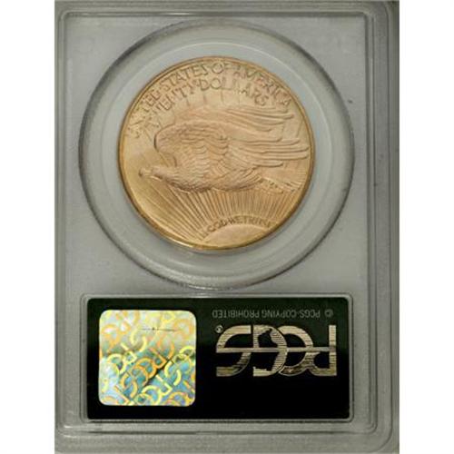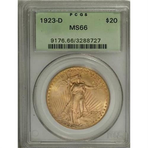 <B>1923-D $20 MS66 PCGS.</B></I> Ample, shimmering luster thickly envelops both sides of this extremely clean and attractive Denver issue. The color is light, with subtle undertones of pastel blue and gold. <BR><I>From The Jacob Collection of Saint-Gaudens Double Eagles.</B></I><BR><BR><B>Coin Engraver:</B> Augustus Saint-Gaudens<BR><BR><b>Shipping:</b> Coins & Currency (<a target="_blank" href="http://www.heritageauctions.com/common/shipping.php">view shipping information</a>)