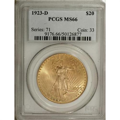 <B>1923-D $20 MS66 PCGS.</B></I> This enticing D-mint Premium Gem offers strong, swirling luster beneath delicate haze that drapes the yellow-gold surfaces. Boldly impressed and beautifully preserved, a remarkable representative of this noted and popular issue. PCGS has certified 57 finer representatives (12/07).<BR><BR><B>Coin Engraver:</B> Augustus Saint-Gaudens<BR><BR><b>Shipping:</b> Coins & Currency (<a target="_blank" href="http://www.heritageauctions.com/common/shipping.php">view shipping information</a>)