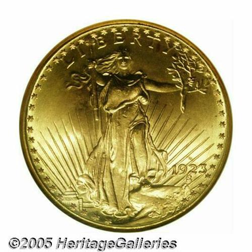 <B>1923-D<$20> MS67 NGC.</B></I> Fortunately for type collectors, a fairly substantial portion of the Uncirculated population of the issue has survived in Gem condition. Why this should be the case for the 1923-D while other issues are predominantly bagmarked or scuffed is likely be a topic for spirited discussion among Saint-Gaudens Double Eagle enthusiasts. The 1923-D is one of the best produced of the available issues in the Saint-Gaudens series, and all of those attributes are on full display on this Superb example. The surfaces boasts an intense satiny sheen, crisp definition, and terrific yellow-gold color with olive peripheral accents.<BR><I>From The Clifford Columbus Collection. Population: 19 in 67, 1 finer (5/05).</B></I>