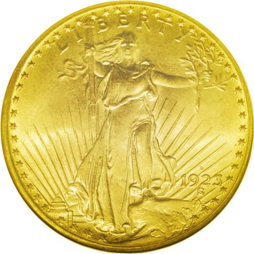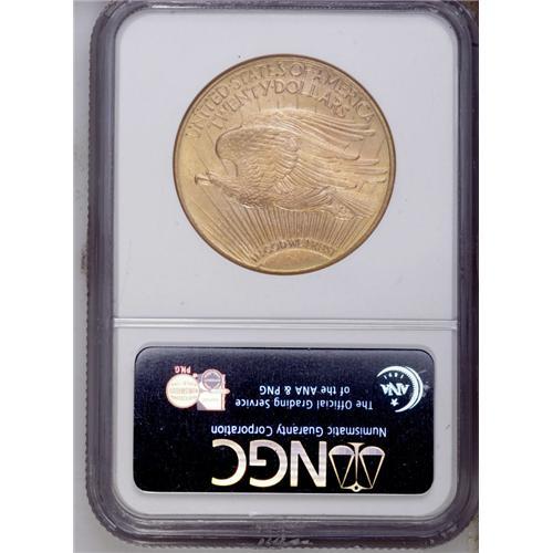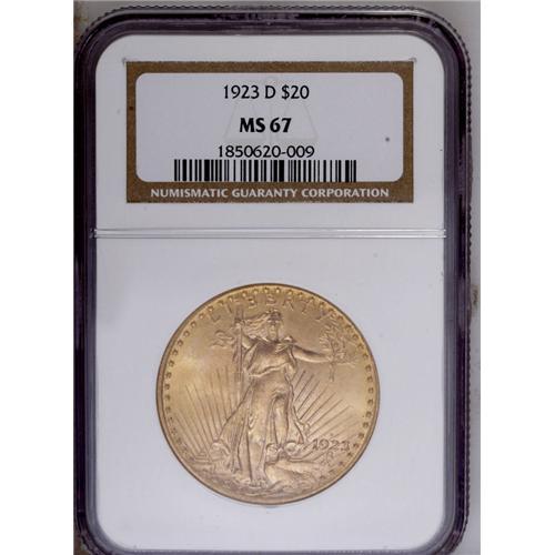 <B>1923-D<$20> MS67 NGC.</B></I> The typical high production quality of the 1923-D Saint-Gaudens double eagle is clearly on display here. The surfaces overall are richly overlaid with softly shimmering mint luster and show light, variegated colors of copper-orange and pale green. The more intricate details of the great design are fully brought up, especially on the eagle's wing and breast feathers. Impressive preservation has left the piece with essentially untroubled fields and devices on each side, an important prerequisite for the Superb Gem grade designation. This coin will draw attention from potential bidders for both exceptional technical merit and superior visual appeal. NGC Census: 26 in 67, 1 finer (6/06).