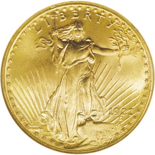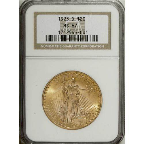 <B>1923-D $20 MS67 NGC.</B></I> This sharply struck and fully lustrous Superb Gem has impressive eye appeal, since close examination fails to reveal any singularly mentionable abrasions on either side. An abundant amount of honey-golden patina endows each side of this well preserved specimen. An interesting curving die crack is seen through LIBERTY at the top of the obverse. Census: 30 in 67, 1 finer (11/06).<BR><BR><b>Shipping:</b> Coin/Currency (<a target="_blank" href="http://www.heritageauctions.com/common/shipping.php">view shipping information</a>)