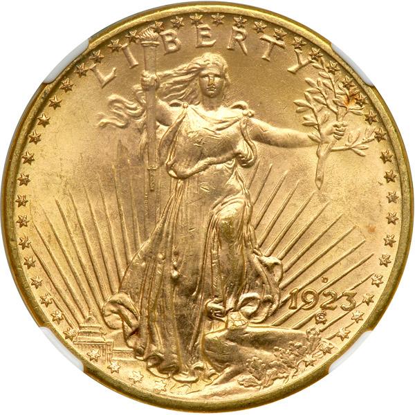1923-D. NGC graded MS-66. Lovely golden toning. Brilliant throughout with lustrous surfaces, there are no impairments on either side that are worthy of mention. The pressure transmitted from the die to the blank reveals itself in sharp designs for Liberty as well as the eagle (PCGS # 9176) .