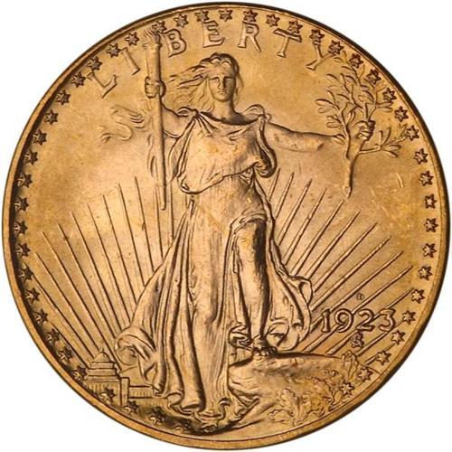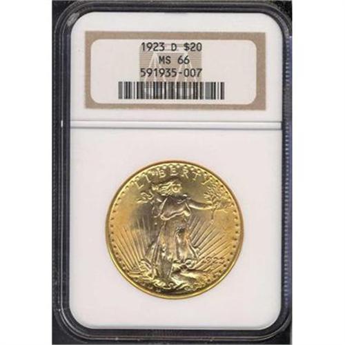 <b>1923-D $20 St. Gaudens. NGC graded MS66.</b> NGC Pop: 680. Both sides are remarkably lustrous with apricot-gold color and a spray of vibrancy in the patina that has to be seen by everyone who every collects $20 gold pieces. Given the proper amount of strike pressure, the coin was fully brought up by the dies <b>(PCGS # 9176)</b> <i>
