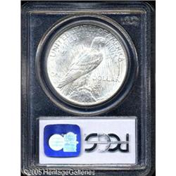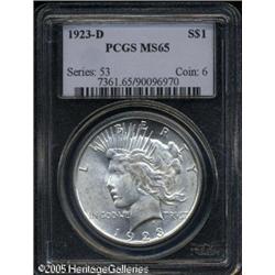 <B>1923-D<img border='0' src='http://www.heritagecoins.com/images/star.gif' width=10 height=10>$1 MS65 PCGS.</B></I> Typically struck, very frosty, and essentially untoned, with rather heavy die cracks (as struck) noticeable near the peripheries, on obverse and reverse alike, and a modicum of trivial surface blemishes and grazes. This issue is somewhat scarce at the Gem grade level, and is rarely found any finer. Lot:10699
