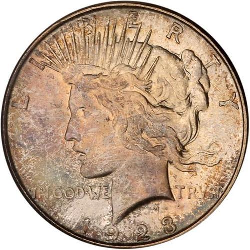 <b>1923-D Peace Dollar. NGC graded MS66.</b> The surfaces are delicately toned, oscillating with silvery color and agreeable pastels, and best of all, quite lustrous. A generous amount of crisp detail for the type, too, including those areas with the usual weak metal flows into the deepest channels of the dies leaving the centers bold <b>(PCGS # 7361)</b>