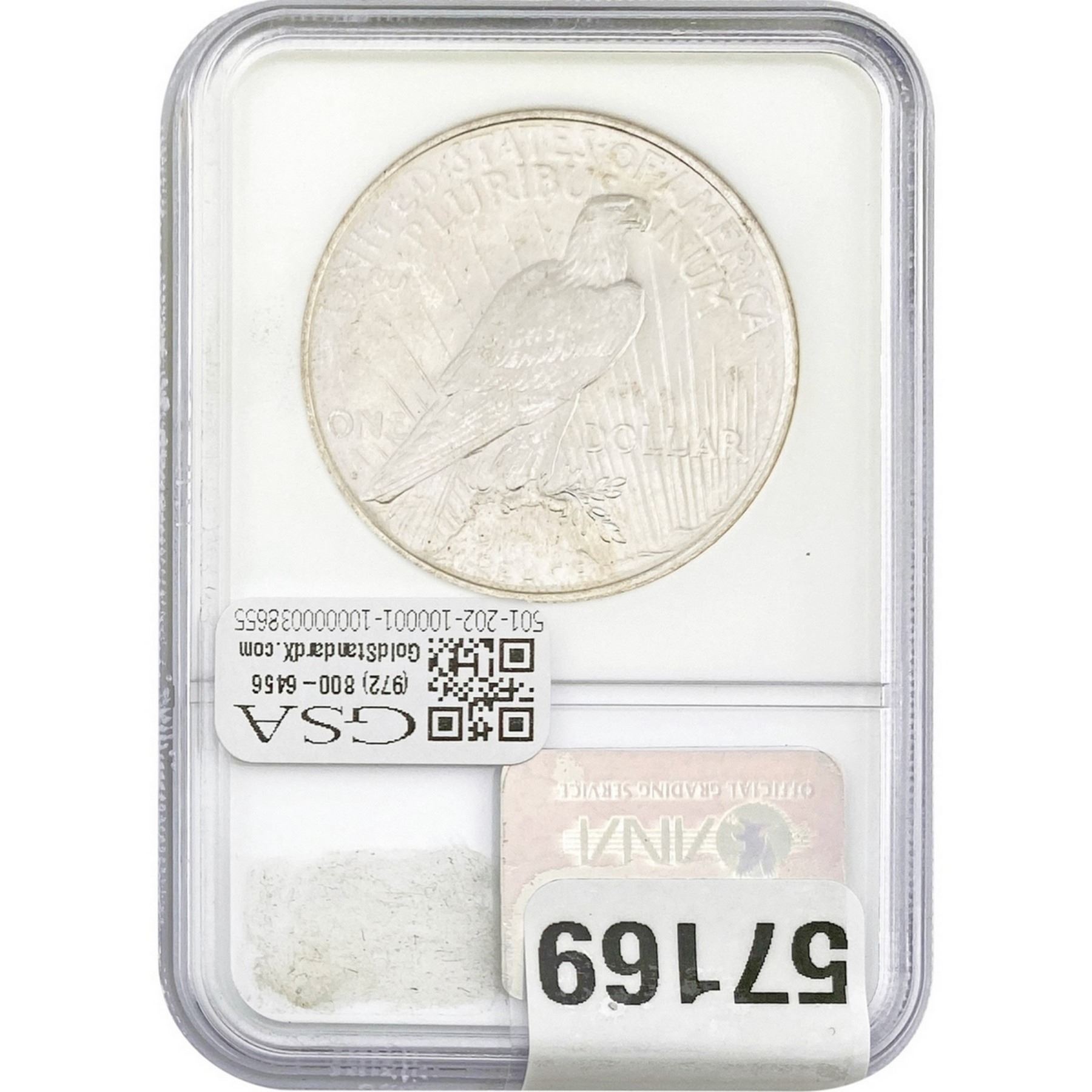 COINS AND CURRENCY LISTED IN GSA’S CATALOG AS GRADED AND ENCAPSULATED BY PCGS, NGC, ANACS, ICG, PCGS CURRENCY, PMG, PCGS BANKNOTE GRADING, CMC OR ANY OTHER THIRD-PARTY GRADING SERVICE ARE LIKEWISE SOLD “AS-IS” EXCEPT AS EXPRESSLY SET FORTH HEREIN. ALL THIRD-PARTY GRADING SERVICE GUARANTEES, INCLUDING AUTHENTICITY, ARE THE SOLE RESPONSIBILITY OF THE THIRD-PARTY GRADING SERVICE AND NOT WARRANTIES OR GUARANTEES OF GSA. BIDDERS SHOULD CONTACT THESE THIRD-PARTY GRADING SERVICES DIRECTLY WITH RESPECT TO ANY CLAIMS OR QUESTIONS THEY MAY HAVE CONCERNING THEIR GUARANTEES AND WARRANTIES. BIDDERS ACKNOWLEDGE AND AGREE THAT AUCTIONEER IS NOT BOUND BY OR LIABLE FOR ANY OPINION OR CERTIFICATION BY ANY THIRD-PARTY GRADING SERVICE. REMOVAL OF A PRODUCT FROM ITS PROTECTIVE CASING OR HOLDER OR ALTERATION OF ANY COIN HOLDER WAIVES ALL RIGHTS CONCERNING THE PRODUCT CONTAINED THEREIN.