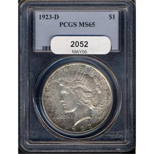 <b>1923-D Peace Dollar. PCGS graded MS65.</b> A heart-thumping gem of this better D-mint issue, the excellent quality one likes to see for this actively collected design. Swirling luster blends evenly with mottled gray highlights on the satin surfaces <b>(PCGS # 7361)</b> <i>