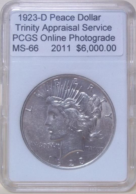 1923 Peace Silver Dollar, Denver Mint, MS-66. PCGS Online Photograde. Appraisal by Trinity Jewelers Appraisal Services. Control # F035025 Value: $6,000.00