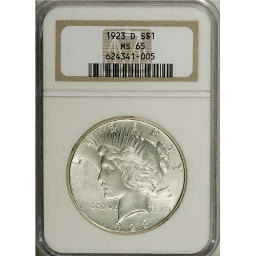 <B>1923-D S$1 MS65 NGC.</B></I> Sharply struck with highly lustrous, slightly satiny surfaces. A touch of amber toning graces the reverse. An important D-mint Peace dollar from an issue generally not located in Gem condition.<BR><BR><b>Shipping:</b> Coins & Currency (<a target="_blank" href="http://www.heritageauctions.com/common/shipping.php">view shipping information</a>)