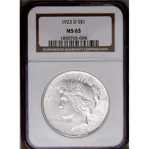 <B>1923-D<img border='0' src='http://www.heritagecoins.com/images/star.gif' width=10 height=10>$1> MS65 NGC.</B></I> This Peace dollar is sharply struck and lustrous. Mostly untoned, though two small spots of hazy toning appear in the right reverse field.