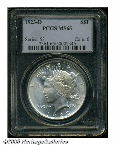 <B>1923-D<S$1> MS65 PCGS.</B></I> Both sides of this '23-D Gem are awash in luster and wisps of golden-tan patina, and the design elements are well brought up. The surfaces are quite well preserved, showing just some minor scuffs on Liberty's cheek and neck, and along the right (facing) obverse periphery. PCGS has seen only 62 pieces finer (4/05).