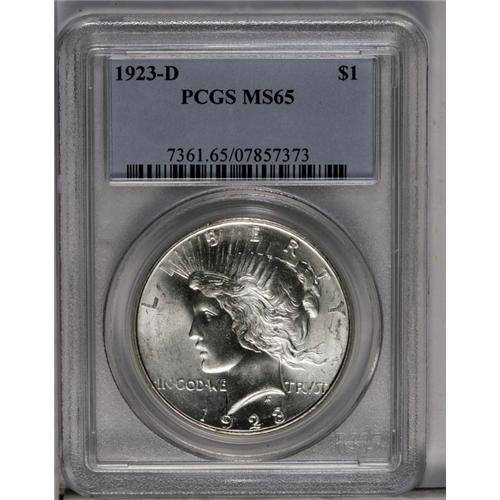 <B>1923-D<img border='0' src='http://www.heritagecoins.com/images/star.gif' width=10 height=10>$1> MS65 PCGS.</B></I> Sparkling luster and sharply struck devices jump out at the viewer. Minimally abraded surfaces are nearly untoned save for a wisp or two of light gold color.