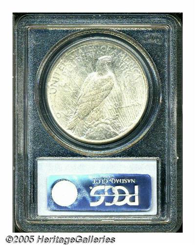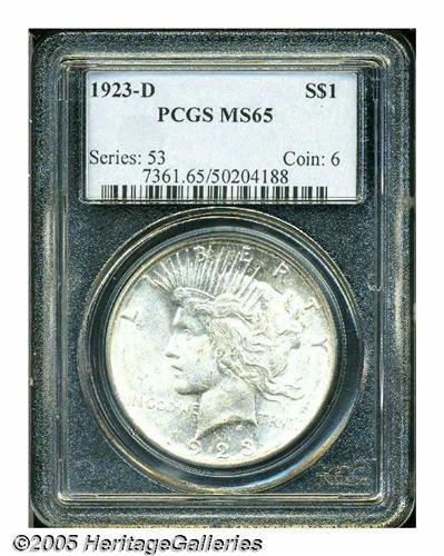 <B>1923-D<S$1> MS65 PCGS.</B></I> This Gem '23-D displays bright highly lustrous surfaces that are visited by speckled tan-gold patina. The design element are relatively well struck. As is typical for this issue, several bagmarks are scattered about, particularly on the eagle, and a few on Liberty's cheek and neck. It is estimated that fewer than 1,000 specimens exist in MS65 grade. A total of 81 pieces have been certified finer by PCGS and NGC combined (4/05).