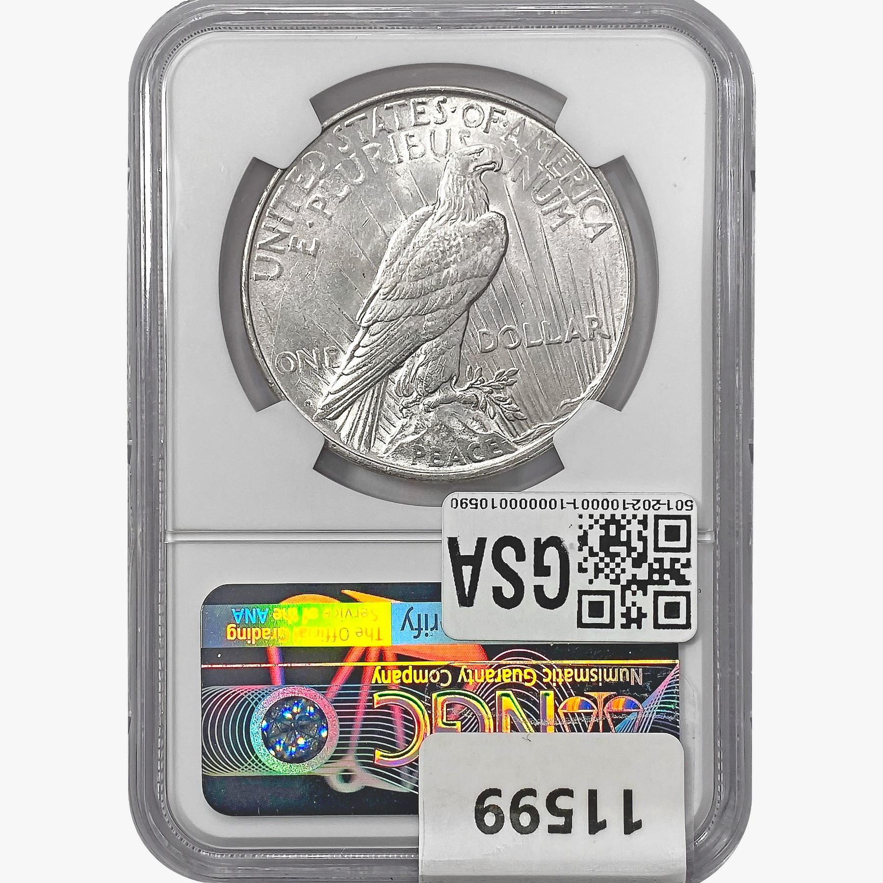 COINS AND CURRENCY LISTED IN GSA’S CATALOG AS GRADED AND ENCAPSULATED BY PCGS, NGC, ANACS, ICG, PCGS CURRENCY, PMG, PCGS BANKNOTE GRADING, CMC OR ANY OTHER THIRD-PARTY GRADING SERVICE ARE LIKEWISE SOLD “AS-IS” EXCEPT AS EXPRESSLY SET FORTH HEREIN. ALL THIRD-PARTY GRADING SERVICE GUARANTEES, INCLUDING AUTHENTICITY, ARE THE SOLE RESPONSIBILITY OF THE THIRD-PARTY GRADING SERVICE AND NOT WARRANTIES OR GUARANTEES OF GSA. BIDDERS SHOULD CONTACT THESE THIRD-PARTY GRADING SERVICES DIRECTLY WITH RESPECT TO ANY CLAIMS OR QUESTIONS THEY MAY HAVE CONCERNING THEIR GUARANTEES AND WARRANTIES. BIDDERS ACKNOWLEDGE AND AGREE THAT AUCTIONEER IS NOT BOUND BY OR LIABLE FOR ANY OPINION OR CERTIFICATION BY ANY THIRD-PARTY GRADING SERVICE. REMOVAL OF A PRODUCT FROM ITS PROTECTIVE CASING OR HOLDER OR ALTERATION OF ANY COIN HOLDER WAIVES ALL RIGHTS CONCERNING THE PRODUCT CONTAINED THEREIN.