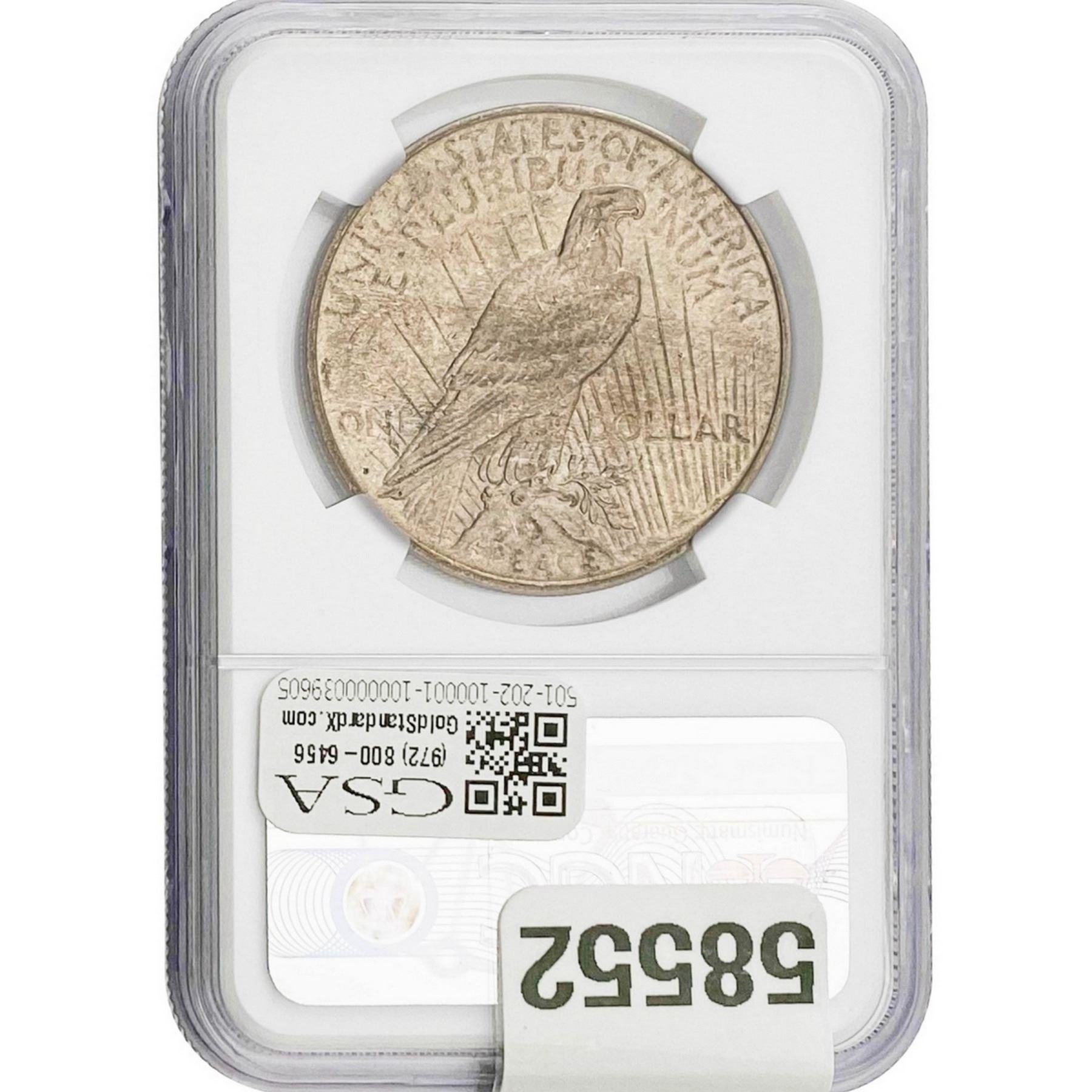 COINS AND CURRENCY LISTED IN GSA’S CATALOG AS GRADED AND ENCAPSULATED BY PCGS, NGC, ANACS, ICG, PCGS CURRENCY, PMG, PCGS BANKNOTE GRADING, CMC OR ANY OTHER THIRD-PARTY GRADING SERVICE ARE LIKEWISE SOLD “AS-IS” EXCEPT AS EXPRESSLY SET FORTH HEREIN. ALL THIRD-PARTY GRADING SERVICE GUARANTEES, INCLUDING AUTHENTICITY, ARE THE SOLE RESPONSIBILITY OF THE THIRD-PARTY GRADING SERVICE AND NOT WARRANTIES OR GUARANTEES OF GSA. BIDDERS SHOULD CONTACT THESE THIRD-PARTY GRADING SERVICES DIRECTLY WITH RESPECT TO ANY CLAIMS OR QUESTIONS THEY MAY HAVE CONCERNING THEIR GUARANTEES AND WARRANTIES. BIDDERS ACKNOWLEDGE AND AGREE THAT AUCTIONEER IS NOT BOUND BY OR LIABLE FOR ANY OPINION OR CERTIFICATION BY ANY THIRD-PARTY GRADING SERVICE. REMOVAL OF A PRODUCT FROM ITS PROTECTIVE CASING OR HOLDER OR ALTERATION OF ANY COIN HOLDER WAIVES ALL RIGHTS CONCERNING THE PRODUCT CONTAINED THEREIN.