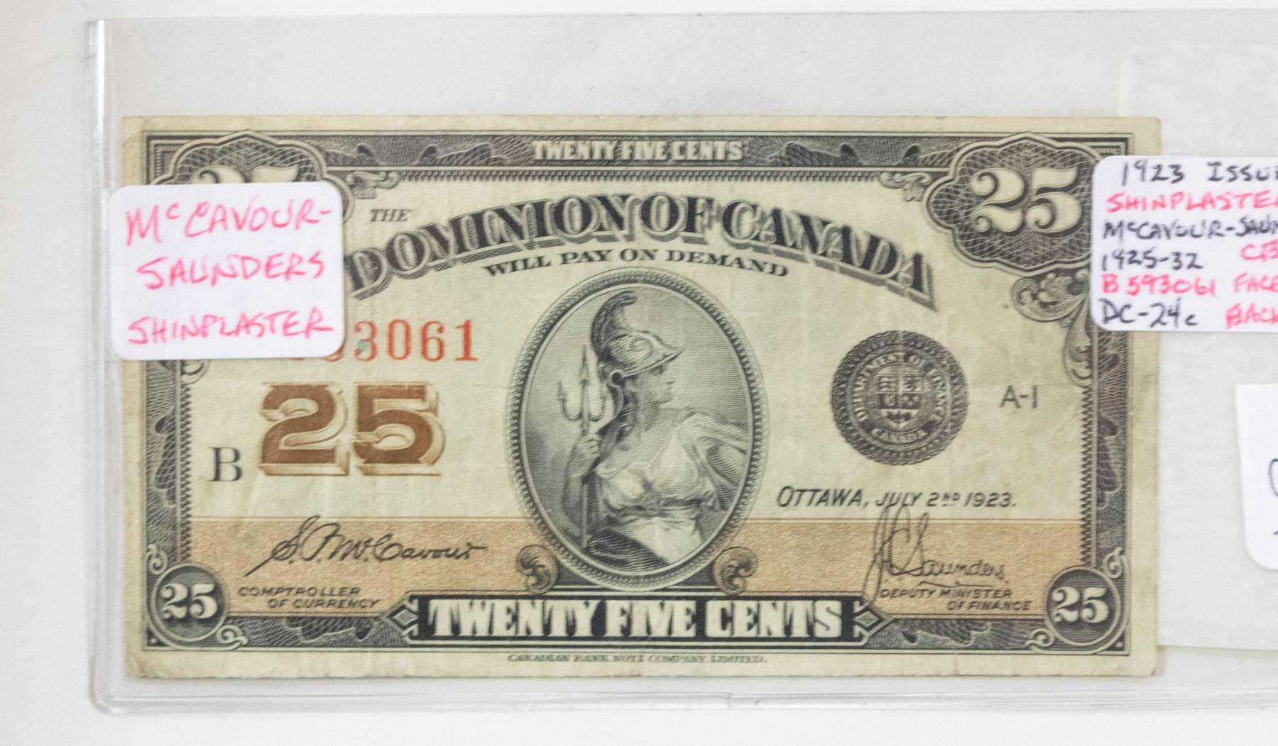1923 DOMINION OF CANADA, $.25 SHIN PLASTER