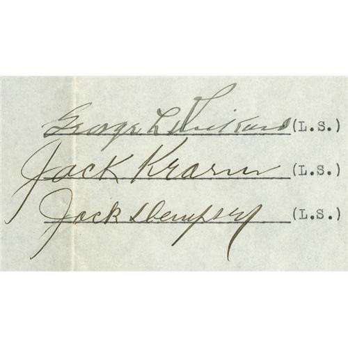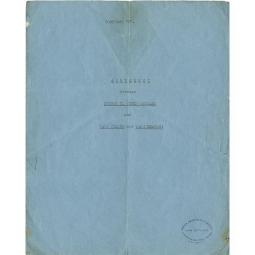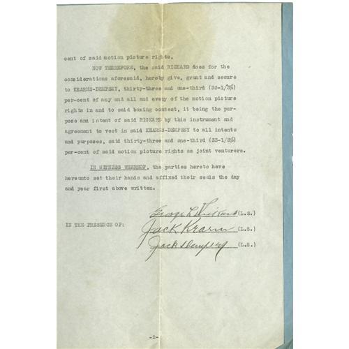 <B>1923 Dempsey vs. Firpo Motion Picture Signed Contract.</B></I> On September 14, 1923, Jack Dempsey successfully defended his World Heavyweight Title stopping the "Wild Bull of the Pampas" Luis Firpo of Argentina in two rounds at the Polo Grounds in New York. The fight was a wild affair with both fighters down in the first round and Dempsey literally knocked out of the ring. Dempsey recovered and inflicted a heavy beating on the giant from South America before ending it with a knockout in the second round. Offered here is a two-page original contract dealing with the motion picture rights of this great fight. Signed and agreed upon before for the match, this contract includes bold ink signatures of Jack Dempsey, his manager Jack Kearns and famous promoter George "Tex" Rickard. The contract is a typed document in its original, unaltered state and is in excellent condition. Any contract from this era is rare, a contract from a fight of this importance is almost unique. <I>LOA from PSA/DNA.</B></I> <BR><BR><B>Important notice:</B> Heritage usually auctions material at the rate of 200-250 lots per hour. On some occasions eBay Live bid software or the Internet may not be able to keep up with the pace of the auction. We recommend placing a realistic absentee bid now as insurance to avoid disappointment. Occasionally the auctioneer may eliminate or reject an eBay Live bid, and the auctioneer may also reopen a lot after the close of the eBay live bidding (usually because we missed an audience bid), and may reject your bid even if it shows you as the winning bidder. By bidding via eBay Live, you agree that Heritage may award the lot to another bidder at its sole discretion under the circumstances described above or any other reasonable circumstances. Since eBay bids are not shown to us until we open the lot on the floor, we treat those bids just like floor bids. In most cases the floor responds before the eBay bid is presented to us, due to Internet lag time, so for consistency we have made it a policy that floor bids are always considered first over tie eBay live bids. Also please note that all Heritage lots purchased through eBay Live carry a 22.5% Buyer's Premium. Please make sure you read the Terms and Conditions before you bid. This lot is being auctioned in conjunction with a live floor auction by Heritage Galleries & Auctioneers. All final auction and invoice information will be supplied by Heritage Galleries & Auctioneers, and all other information should be considered preliminary. Lot:19147 <BR><BR><B>Winning Notification and Billing:</B> After the FINAL session in this auction is complete, Heritage will send e-mail and snail mail invoices. This process normally takes several days. All final auction and invoice information will be supplied by Heritage Galleries & Auctioneers, and all other information should be considered preliminary. <BR><BR>This auction will be conducted on a live auction floor and over the Internet through eBay Live. If you choose to place an absentee bid, please take a moment to <font color='#0000ff'><u><a href='http://pages.ebay.com/liveauctions/help/before/laabsentee.html'>learn how eBay Live absentee bidding works</a></u></font><font color='#000000'>