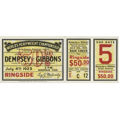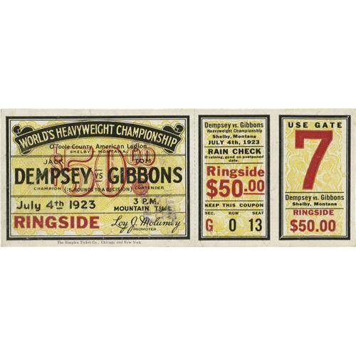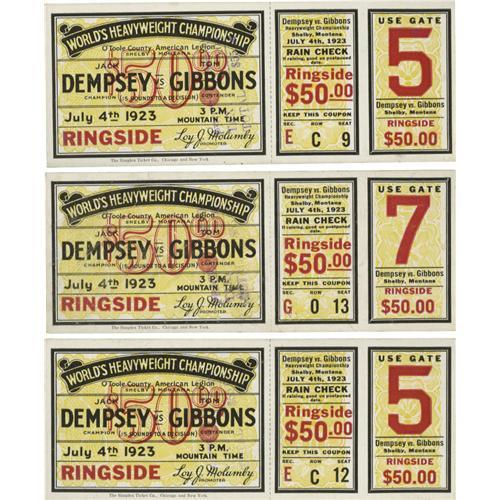 <B>1923 Dempsey vs. Gibbons Fight Full Tickets Lot of 3.</B></I> One of the greatest disasters in the history of fight promotion is recalled with this historic trio of full tickets, grim reminders of a fight that essentially bankrupted the small town of Shelby, Montana. Their existence in unused state exhibits the very problem that spurred the financial tragedy--rumors that the fight would not take place kept the vast majority of spectators from boarding trains to Shelby, and the fight saw only 7,000 tickets in the massive new arena sold and 13,000 spectators crashing the gates for free. Local banks that had fronted the money for the huge purses for the fighters went under, and the great Golden Age pugilist and eventual victor Jack Dempsey barely escaped the town with his life. All three tickets are for the expensive fifty dollar Ringside seats, and each presents in conservative EX-MT condition, with nothing more than minor edge wear to report. <BR><BR><B>Important notice:</B> Heritage usually auctions material at the rate of 200-250 lots per hour. On some occasions eBay Live bid software or the Internet may not be able to keep up with the pace of the auction. We recommend placing a realistic absentee bid now as insurance to avoid disappointment. Occasionally the auctioneer may eliminate or reject an eBay Live bid, and the auctioneer may also reopen a lot after the close of the eBay live bidding (usually because we missed an audience bid), and may reject your bid even if it shows you as the winning bidder. By bidding via eBay Live, you agree that Heritage may award the lot to another bidder at its sole discretion under the circumstances described above or any other reasonable circumstances. Since eBay bids are not shown to us until we open the lot on the floor, we treat those bids just like floor bids. In most cases the floor responds before the eBay bid is presented to us, due to Internet lag time, so for consistency we have made it a policy that floor bids are always considered first over tie eBay live bids. Also please note that all Heritage lots purchased through eBay Live carry a 22.5% Buyer's Premium. Please make sure you read the Terms and Conditions before you bid. This lot is being auctioned in conjunction with a live floor auction by Heritage Galleries & Auctioneers. All final auction and invoice information will be supplied by Heritage Galleries & Auctioneers, and all other information should be considered preliminary. Lot:19146 <BR><BR><B>Winning Notification and Billing:</B> After the FINAL session in this auction is complete, Heritage will send e-mail and snail mail invoices. This process normally takes several days. All final auction and invoice information will be supplied by Heritage Galleries & Auctioneers, and all other information should be considered preliminary. <BR><BR>This auction will be conducted on a live auction floor and over the Internet through eBay Live. If you choose to place an absentee bid, please take a moment to <font color='#0000ff'><u><a href='http://pages.ebay.com/liveauctions/help/before/laabsentee.html'>learn how eBay Live absentee bidding works</a></u></font><font color='#000000'>