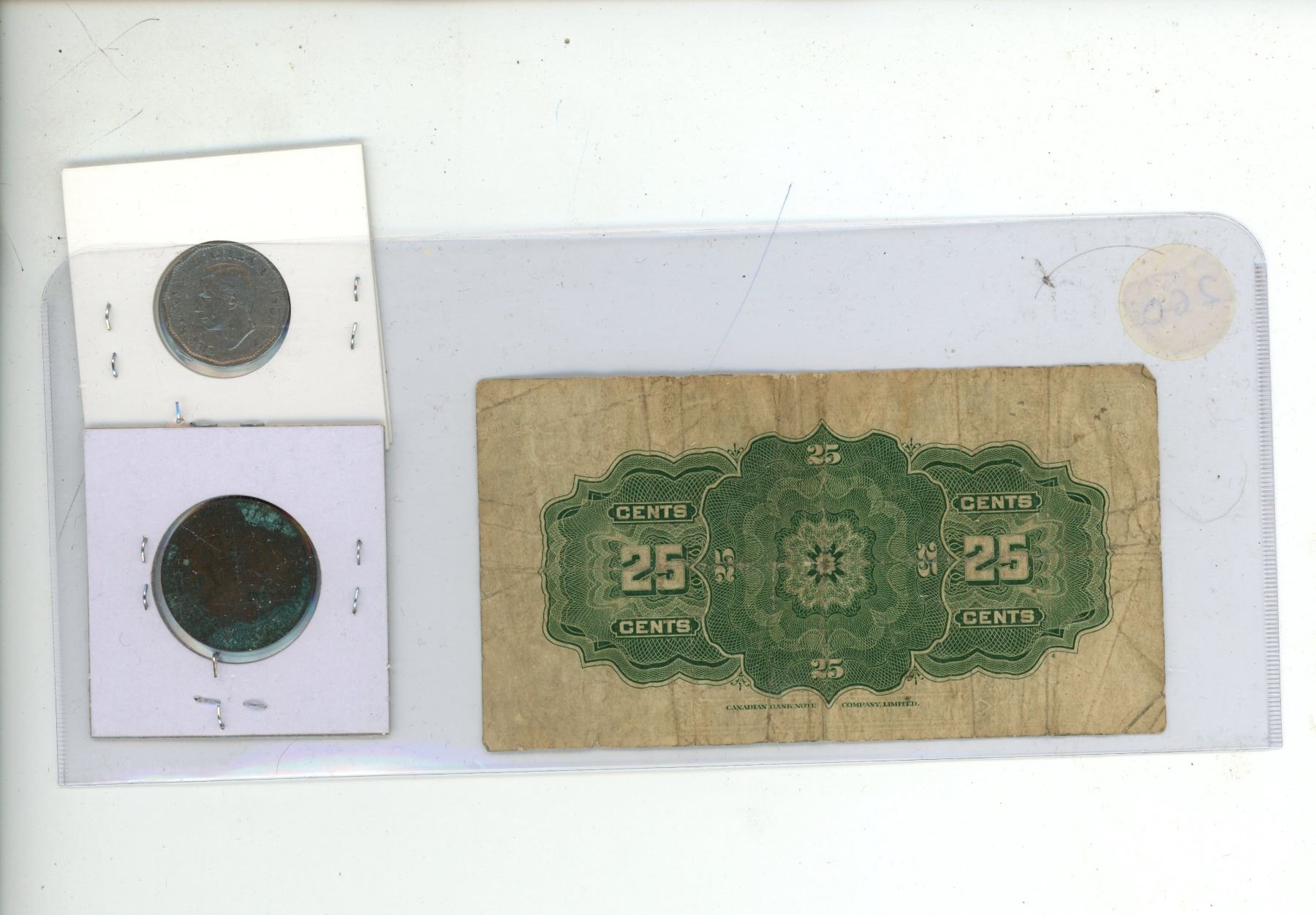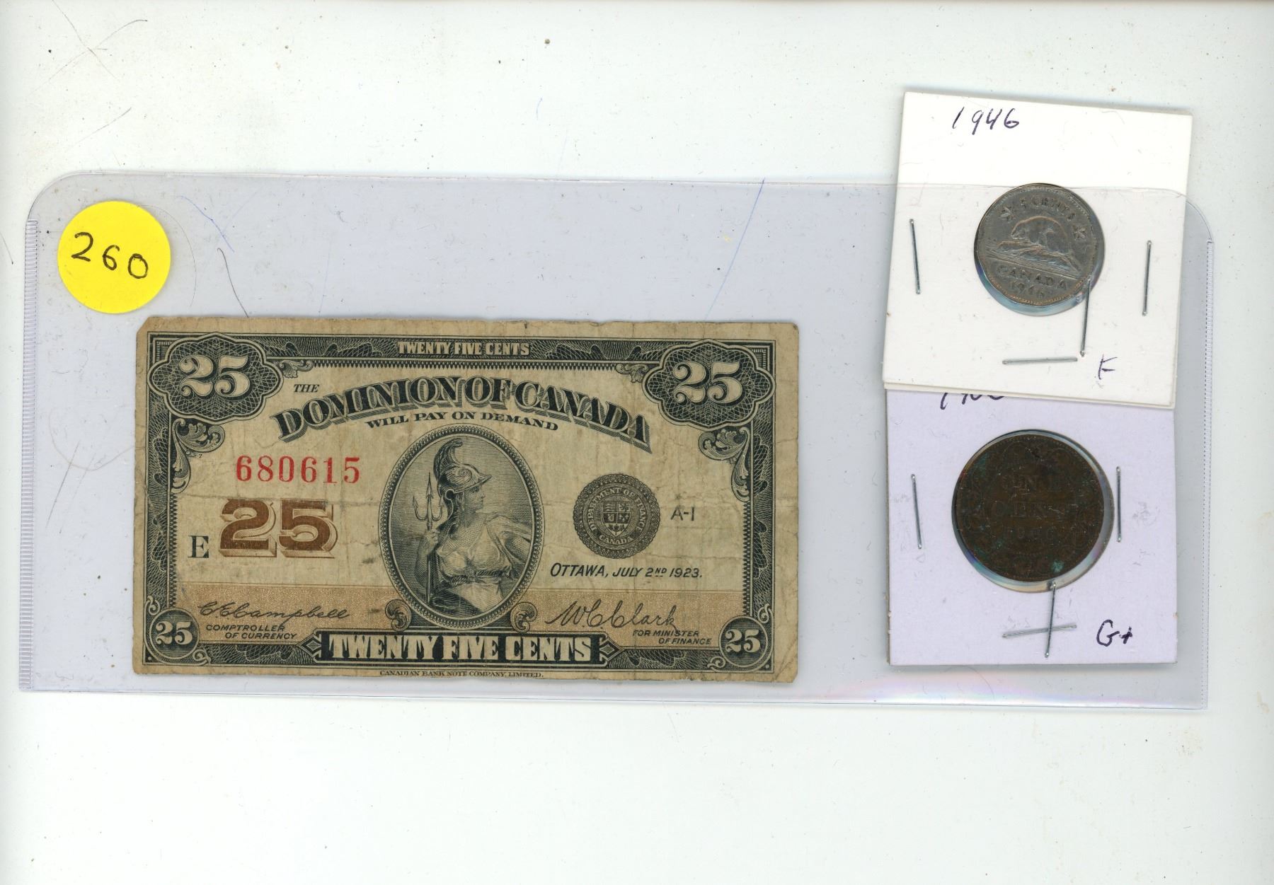 1923 Domination of Canada Shinplaster, 1946 Canadian 5 Cent and 1906 Canadian 1 Cent.