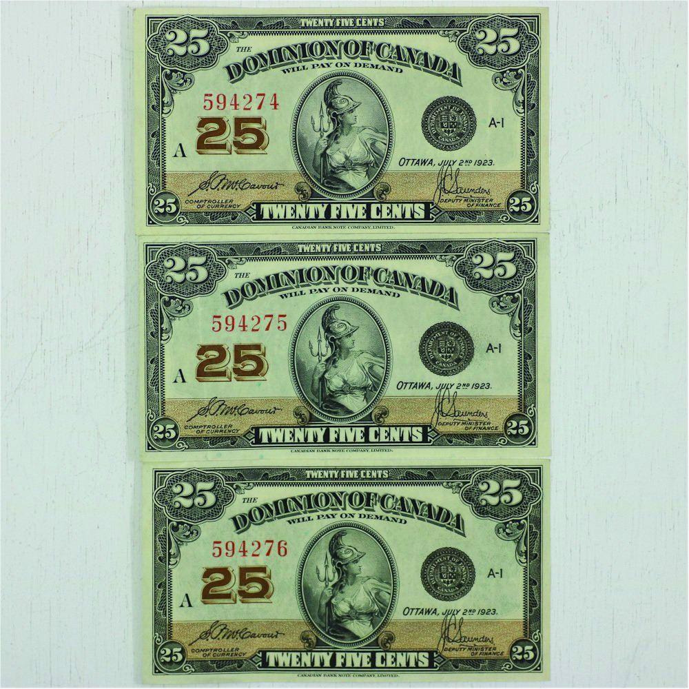 1923 Dominion of Canada 25c Lot of 3 with consecutive serial numbers, EF-AU conditions. DC-24c, S/N: 594274-594276. All nice original examples.