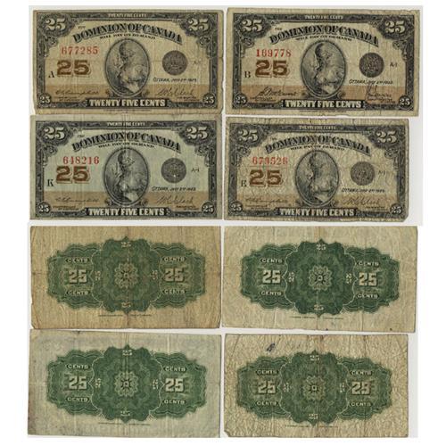 4 shinplasters; 1xMcCavour-Saunders #169778 about Fine and 3xCampbell-Clark #679526 in aVG heavy fold; #677285 VG/F and #648216 aVF with creases & folds. DC-24c,d and no return.