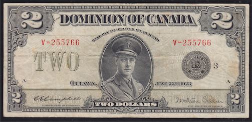 1923 Dominion of Canada Two Dollars CH DC-26j. Black seal, group 3. F-VF. S/N:V-255766/A.