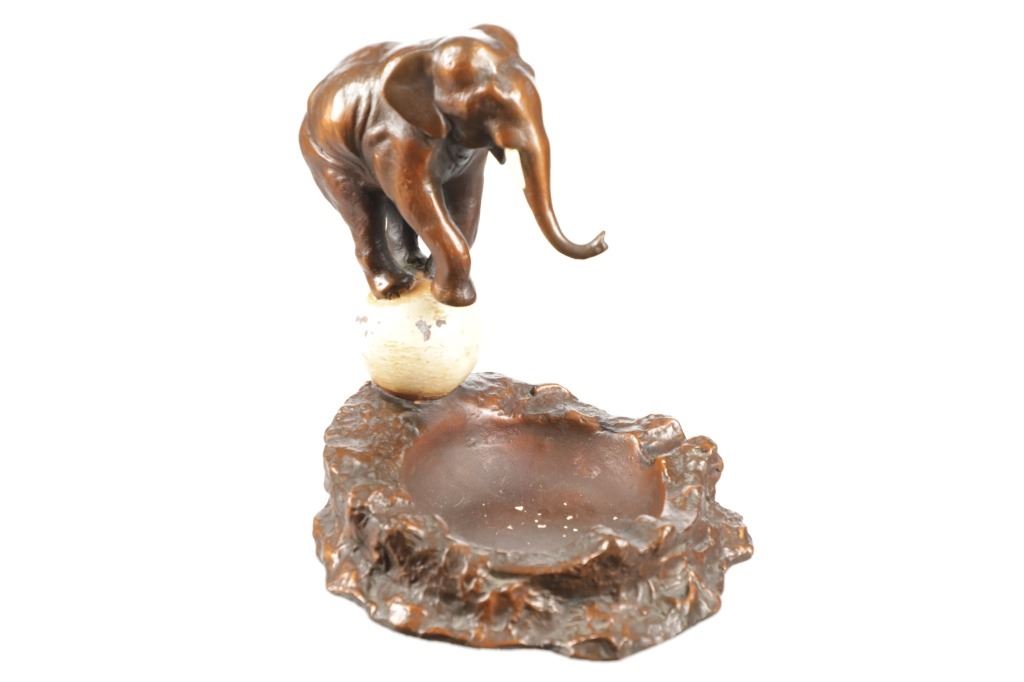 Featured in this lot is this bronze elephant cigar ashtray made by Armour Bronze in New York circa 1923. Armor Bronze, formerly The National Metalizing Company, began in 1910 in New York and New Jersey. Changing the name to Armor bronze about 1920, they produced art objects, statuary, and lamps using a polychrome coloring process with its roots in ancient Egyptian and Chinese methods. They sometimes employed hand-etched sgraffito on their pieces. The company changed location in the 1930's to Massachusetts. It stopped producing in the late 1940s. The ashtray shows a bronze elephant standing on a beige colored ball overlooking the tray. Around the rim of the tray are three slots for holding cigars. The bottom features an Armour Bronze sticker, while the back of the sculpture is marked reading, "Armour Bronze Corp. / ©1923". The piece shows good condition overall with some slight wear present and paint chipping on the ball. No signs of obvious damage is present. The ashtray measures 10 1/2" L x 8 5/8" W x 10 1/2" H and weighs 9 pounds and 8 ounces.
