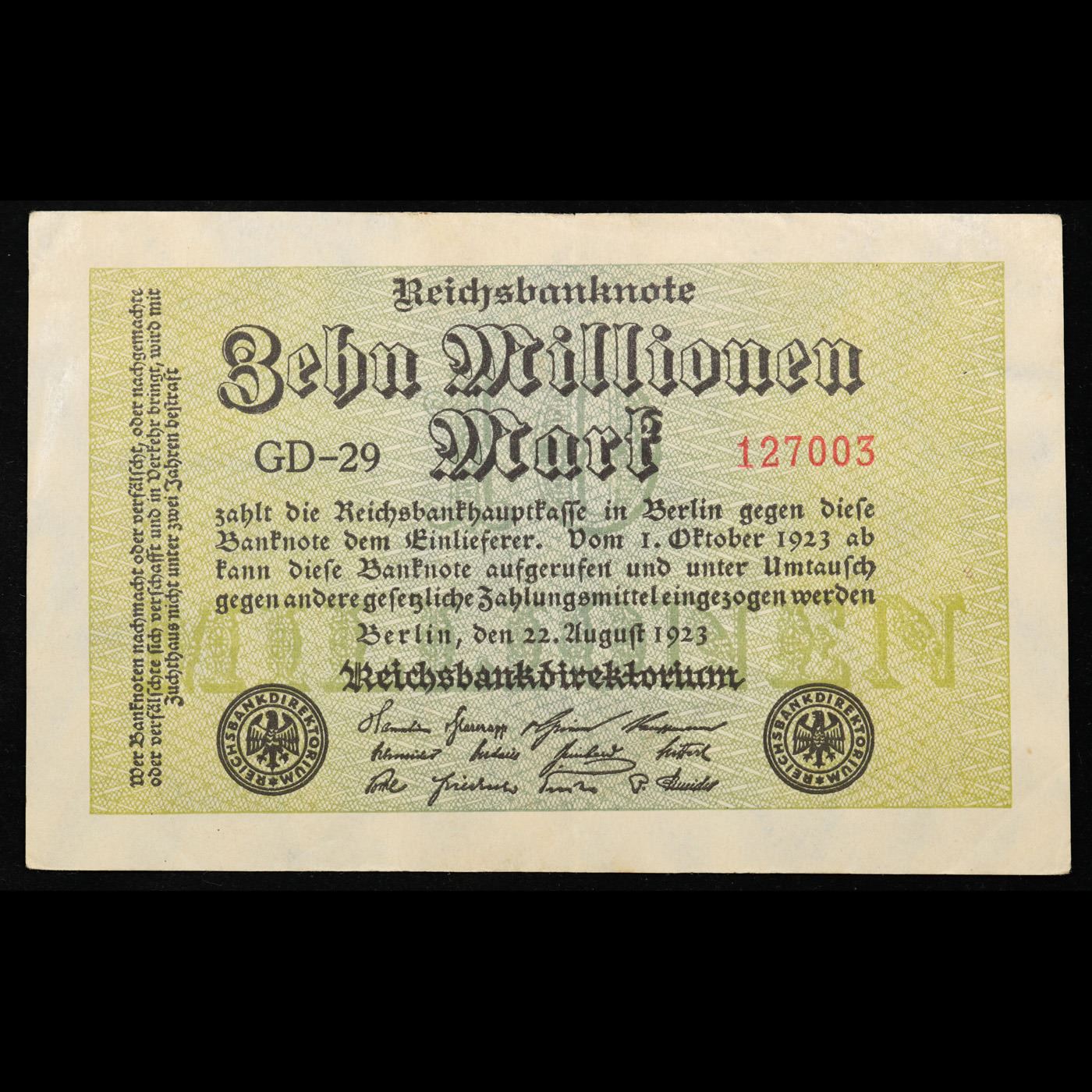 1923 Fifth Issue Germany 10 Million Mark Post-WWI Hyperinflation Banknote P# 106a, Watermark: G/D in