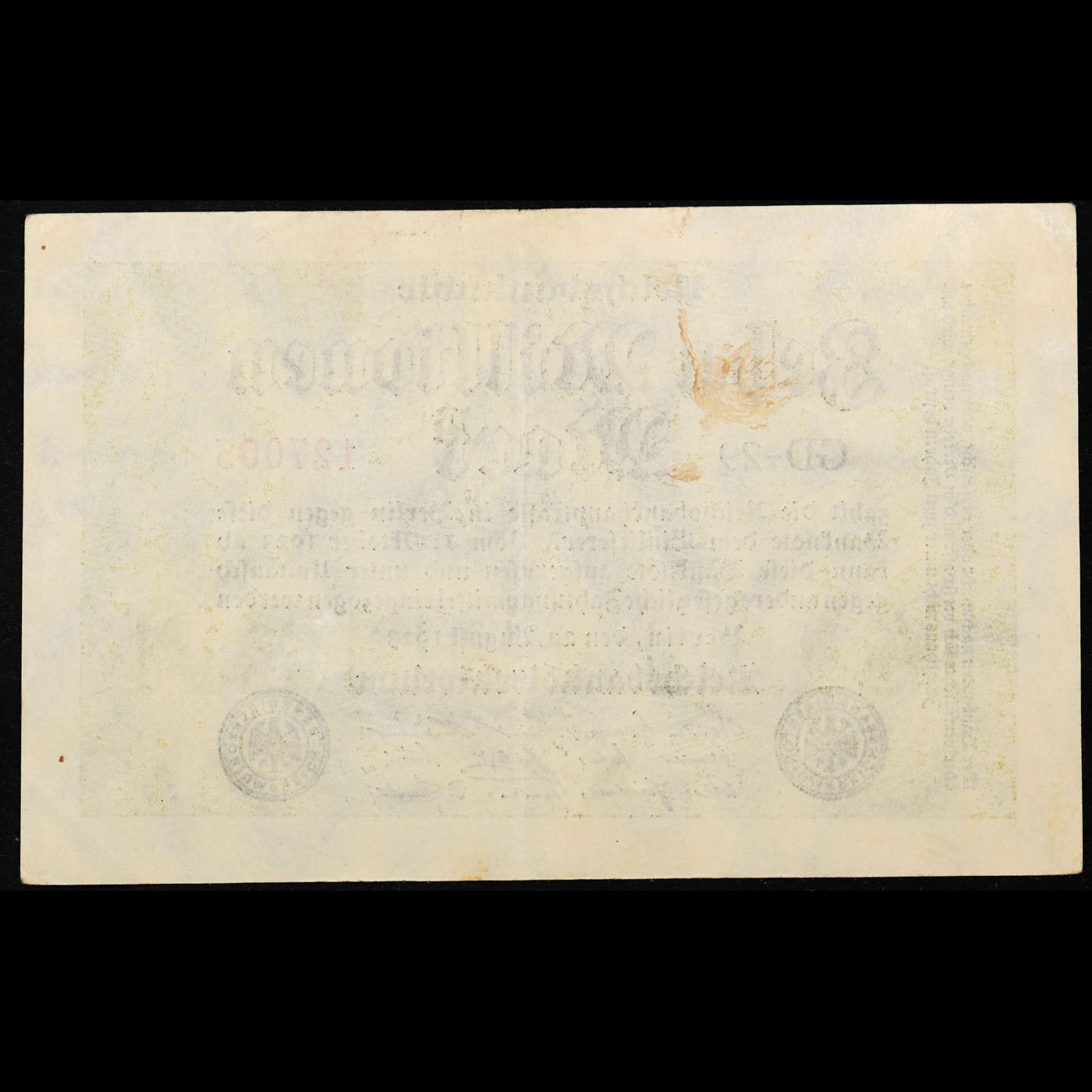 1923 Fifth Issue Germany 10 Million Mark Post-WWI Hyperinflation Banknote P# 106a, Watermark: G/D in stars Grades Choice AU/BU Slider. In the early 1920s, post-WWI Germany saw its economy spiraling out of control. Hyperinflation started directly after the war in 1918, but truly took over the Weimar Republic from 1921 to 1923. The value of the Mark declined incredibly rapidly. 1 USD was equal to 50 German Marks at the beginning of 1920. Toward the end of 1923, 1 USD was equal to over 4,200,000,000,000 German Marks. At times, denominations of the Mark became less valuable than the paper and labor to print it almost immediately after printing. Thus, denominations of the Mark notes became incredibly large, ending up in the tens of trillions.