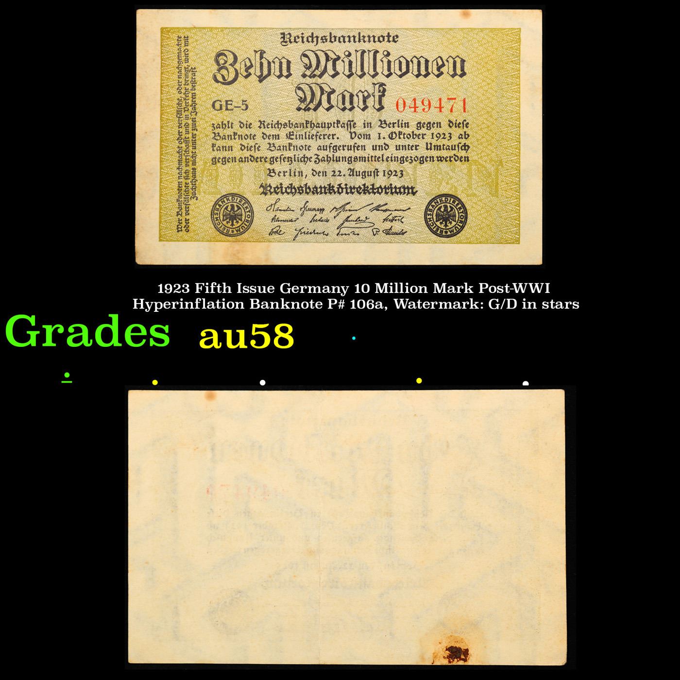 1923 Fifth Issue Germany 10 Million Mark Post-WWI Hyperinflation Banknote P# 106a, Watermark: G/D in stars Grades Choice AU/BU Slider. In the early 1920s, post-WWI Germany saw its economy spiraling out of control. Hyperinflation started directly after the war in 1918, but truly took over the Weimar Republic from 1921 to 1923. The value of the Mark declined incredibly rapidly. 1 USD was equal to 50 German Marks at the beginning of 1920. Toward the end of 1923, 1 USD was equal to over 4,200,000,000,000 German Marks. At times, denominations of the Mark became less valuable than the paper and labor to print it almost immediately after printing. Thus, denominations of the Mark notes became incredibly large, ending up in the tens of trillions.