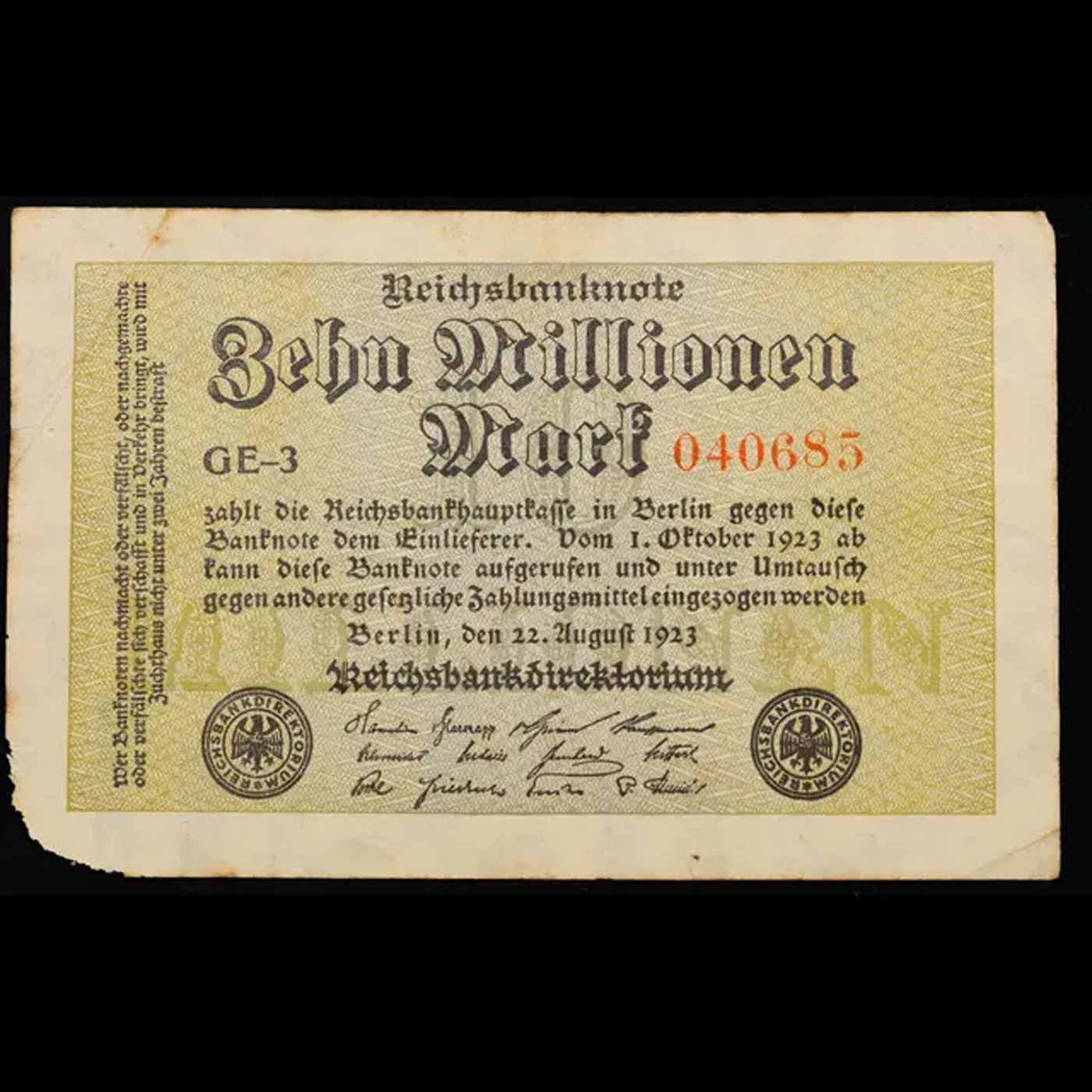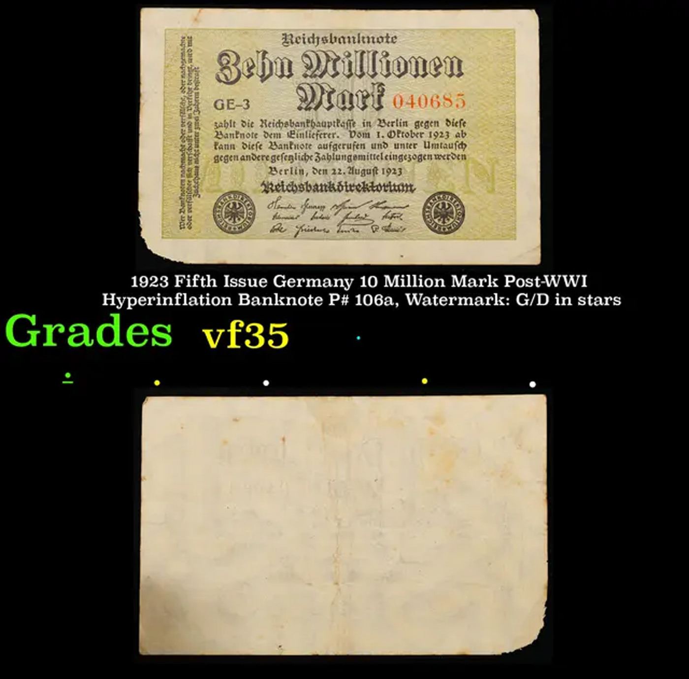 1923 Fifth Issue Germany 10 Million Mark Post-WWI Hyperinflation Banknote P# 106a, Watermark: G/D in stars Grades vf++. In the early 1920s, post-WWI Germany saw its economy spiraling out of control. Hyperinflation started directly after the war in 1918, but truly took over the Weimar Republic from 1921 to 1923. The value of the Mark declined incredibly rapidly. 1 USD was equal to 50 German Marks at the beginning of 1920. Toward the end of 1923, 1 USD was equal to over 4,200,000,000,000 German Marks. At times, denominations of the Mark became less valuable than the paper and labor to print it almost immediately after printing. Thus, denominations of the Mark notes became incredibly large, ending up in the tens of trillions.