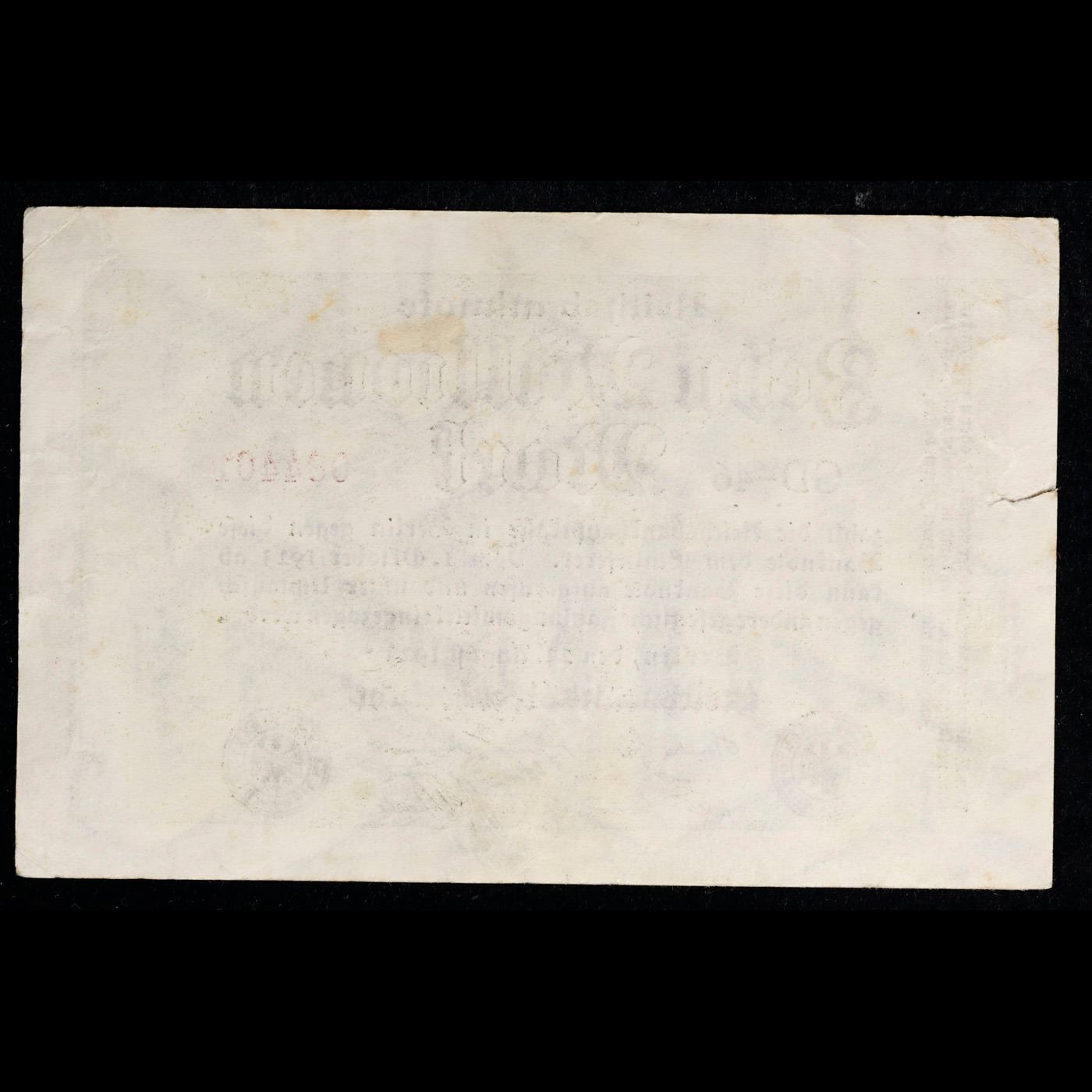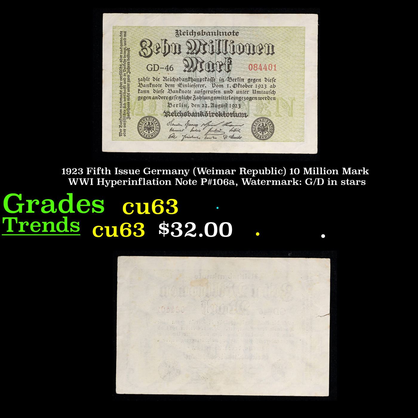 1923 Fifth Issue Germany (Weimar Republic) 10 Million Mark WWI Hyperinflation Note P#106a, Watermark: G/D in stars Grades Select CU. In the early 1920s, post-WWI Germany saw its economy spiraling out of control. Hyperinflation started directly after the war in 1918, but truly took over the Weimar Republic from 1921 to 1923. The value of the Mark declined incredibly rapidly. 1 USD was equal to 50 German Marks at the beginning of 1920. Toward the end of 1923, 1 USD was equal to over 4,200,000,000,000 German Marks. At times, denominations of the Mark became less valuable than the paper and labor to print it almost immediately after printing. Thus, denominations of the Mark notes became incredibly large, ending up in the tens of trillions.
