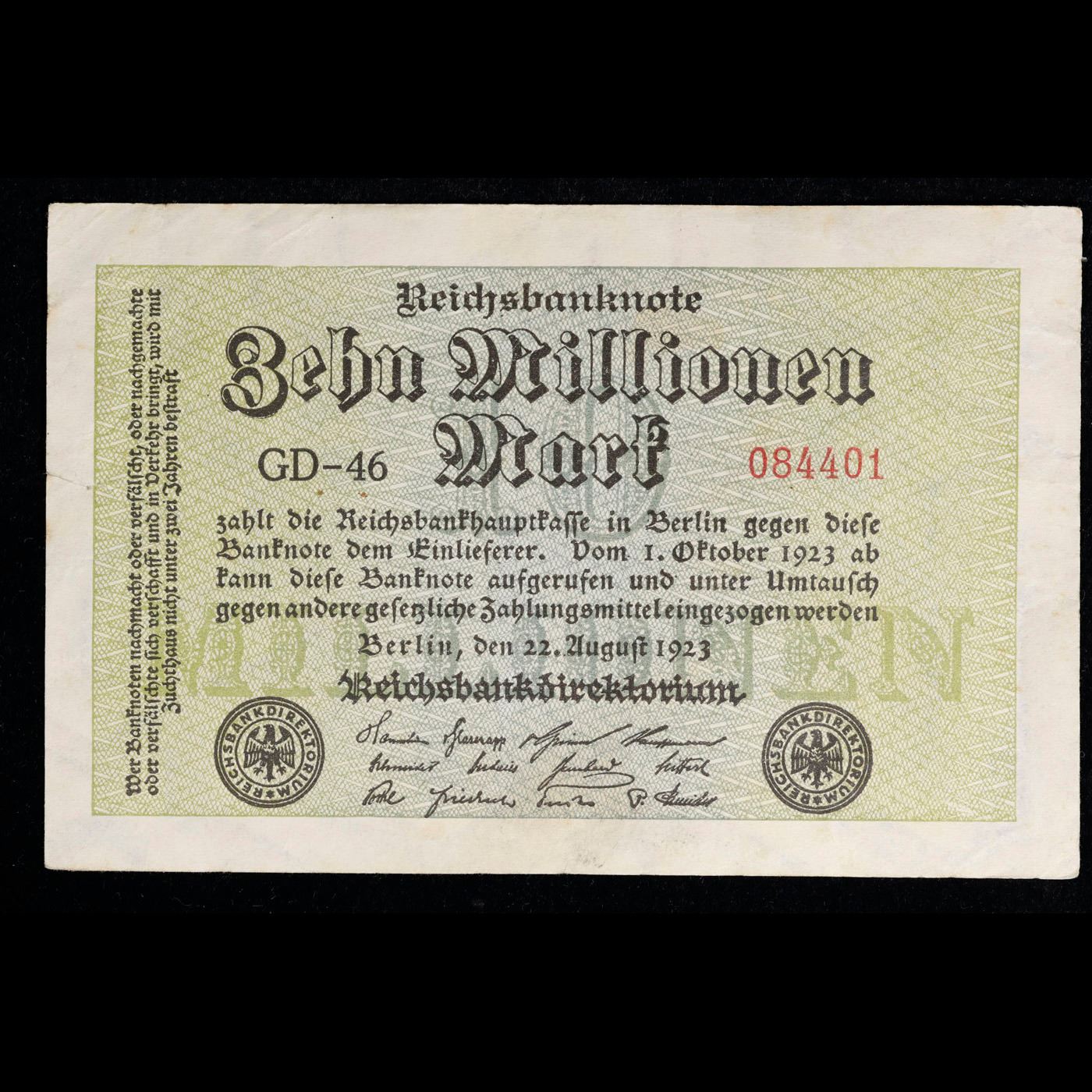 1923 Fifth Issue Germany (Weimar Republic) 10 Million Mark WWI Hyperinflation Note P#106a, Watermark