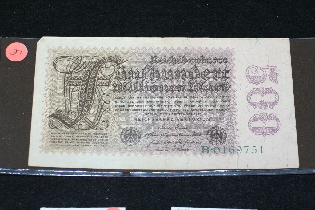 1923 German 500 Funfhundert Millionen Mark Foreign Bank Note
