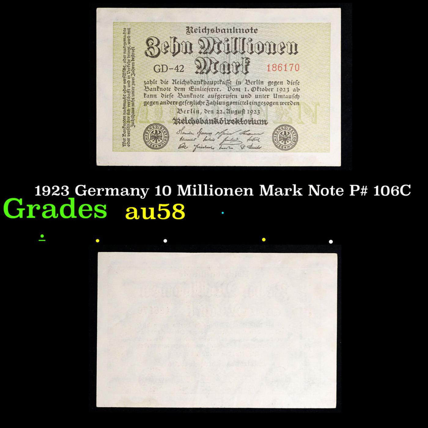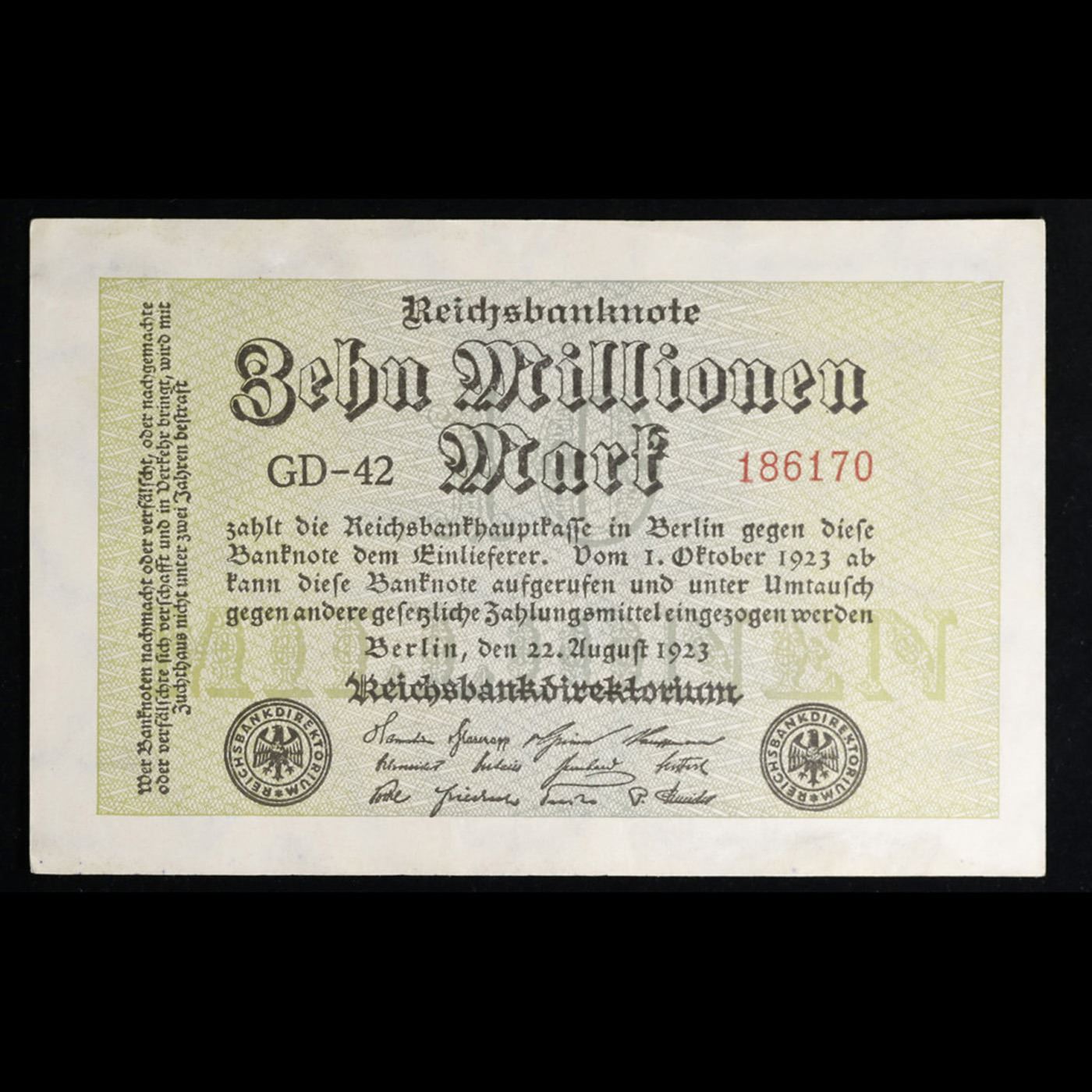 1923 Germany 10 Millionen Mark Note P# 106C Grades Choice AU/BU Slider. In the early 1920s, post-WWI Germany saw its economy spiraling out of control. Hyperinflation started directly after the war in 1918, but truly took over the Weimar Republic from 1921 to 1923. The value of the Mark declined incredibly rapidly. 1 USD was equal to 50 German Marks at the beginning of 1920. Toward the end of 1923, 1 USD was equal to over 4,200,000,000,000 German Marks. At times, denominations of the Mark became less valuable than the paper and labor to print it almost immediately after printing. Thus, denominations of the Mark notes became incredibly large, ending up in the tens of trillions.