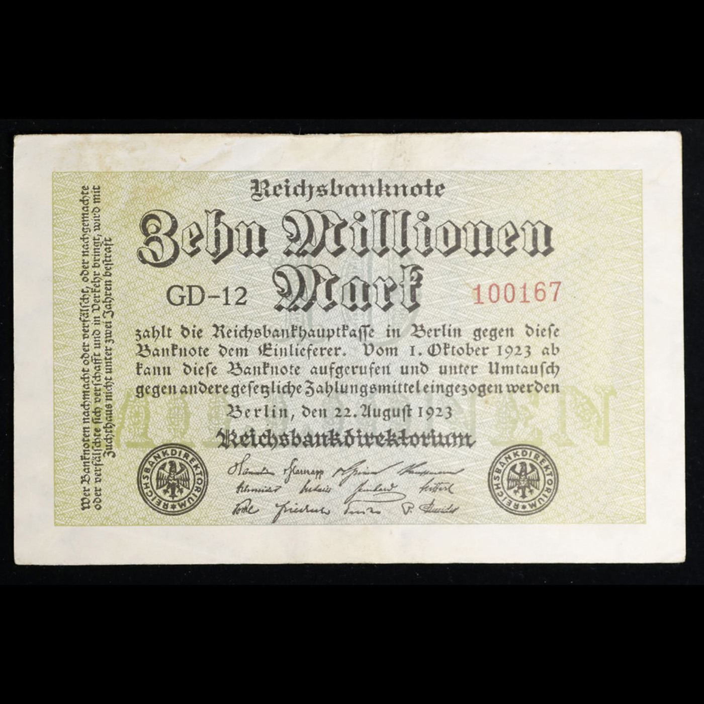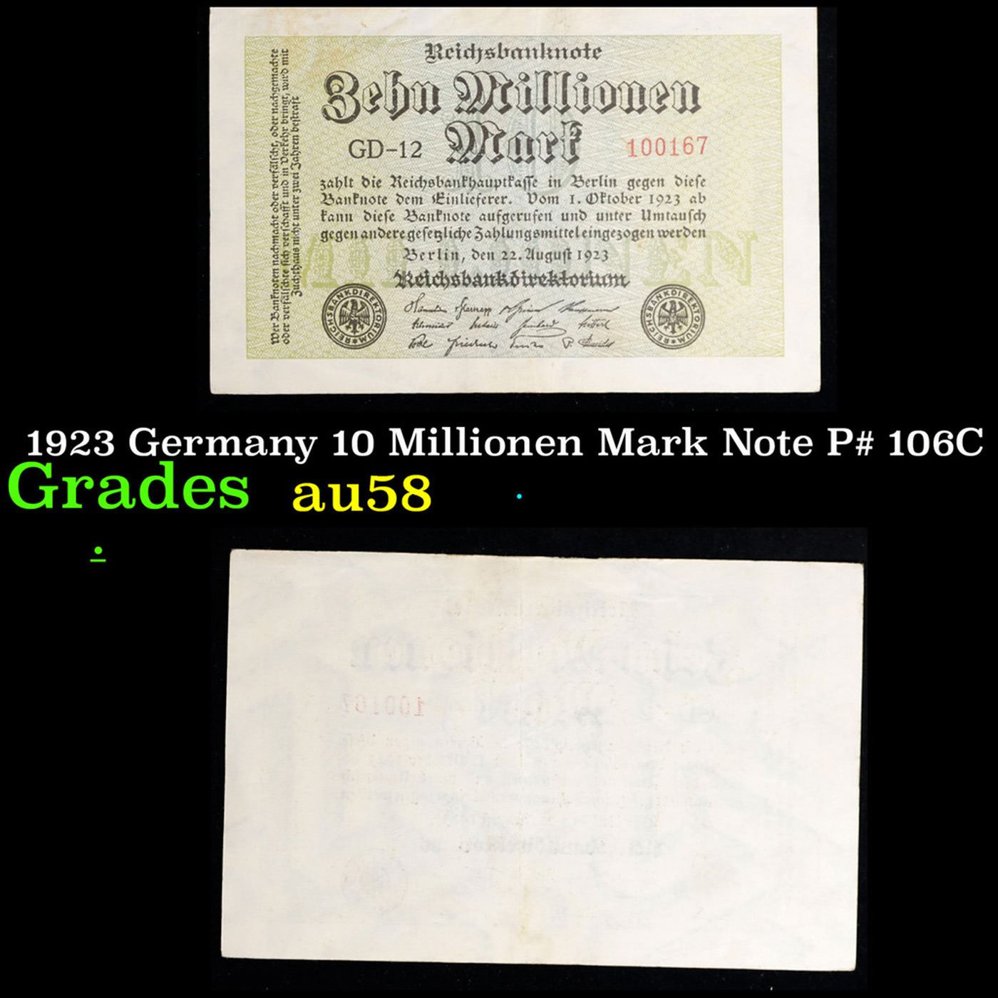 1923 Germany 10 Millionen Mark Note P# 106C Grades Choice AU/BU Slider. In the early 1920s, post-WWI Germany saw its economy spiraling out of control. Hyperinflation started directly after the war in 1918, but truly took over the Weimar Republic from 1921 to 1923. The value of the Mark declined incredibly rapidly. 1 USD was equal to 50 German Marks at the beginning of 1920. Toward the end of 1923, 1 USD was equal to over 4,200,000,000,000 German Marks. At times, denominations of the Mark became less valuable than the paper and labor to print it almost immediately after printing. Thus, denominations of the Mark notes became incredibly large, ending up in the tens of trillions.
