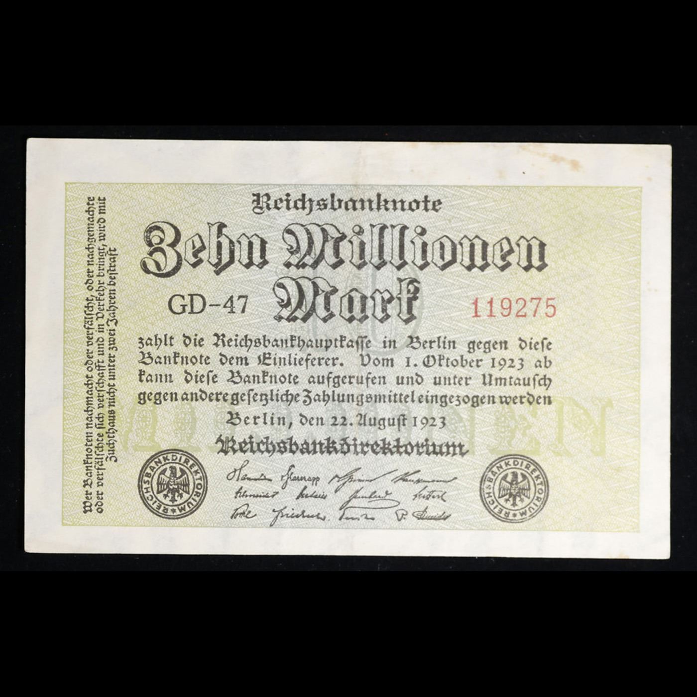 1923 Germany 10 Millionen Mark Note P# 106C Grades Select AU. In the early 1920s, post-WWI Germany saw its economy spiraling out of control. Hyperinflation started directly after the war in 1918, but truly took over the Weimar Republic from 1921 to 1923. The value of the Mark declined incredibly rapidly. 1 USD was equal to 50 German Marks at the beginning of 1920. Toward the end of 1923, 1 USD was equal to over 4,200,000,000,000 German Marks. At times, denominations of the Mark became less valuable than the paper and labor to print it almost immediately after printing. Thus, denominations of the Mark notes became incredibly large, ending up in the tens of trillions.